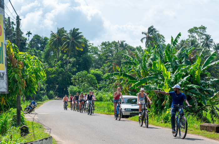 Am Vormittag unternimmst du mit deinen Travel-Buddys eine geführte Fahrradtour, die durch üppige Reisfelder und ländliche Dörfer führt. Unterwegs genießt du den ruhigen Teil der Insel und entdeckst malerische Orte. Bei einem kleinen Zwischenstopp an einer lokalen Kokosnussfarm, kannst du dich mit frischem Kokosnusswasser erfrischen, bevor du dich wieder aufs Rad schwingst.