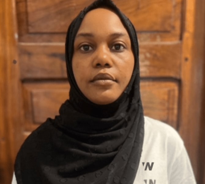 Freiwillige in bunter Kleidung in Sansibar hält ein Baby liebevoll im Arm vor blauer, verwitterter Wand und lächelt es an