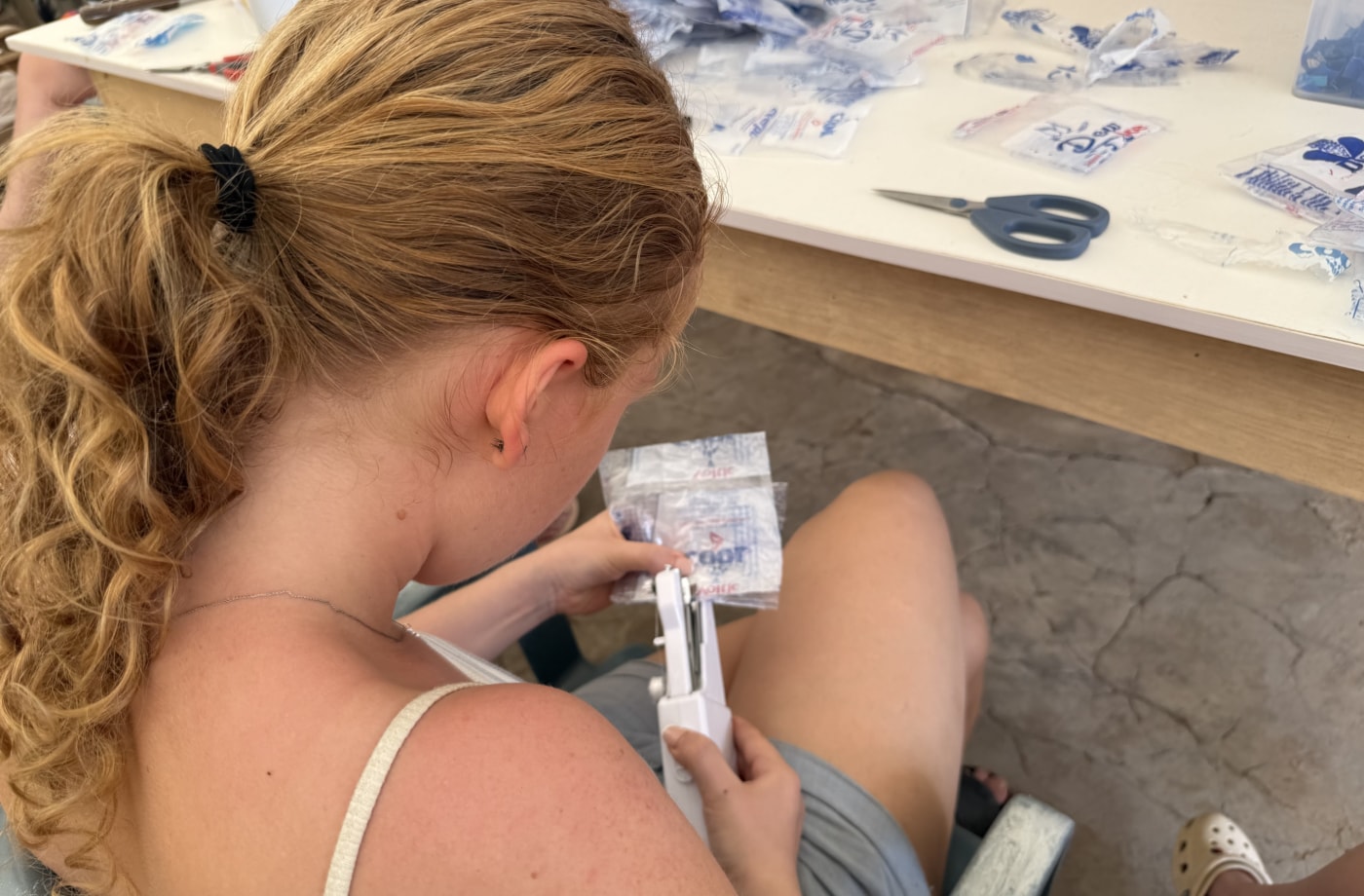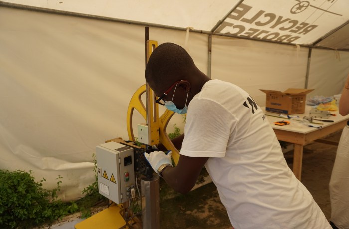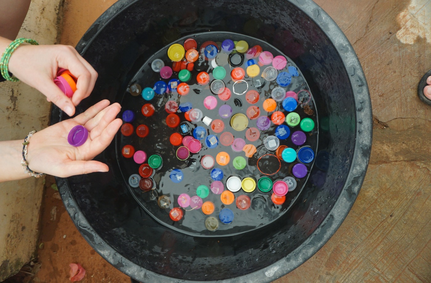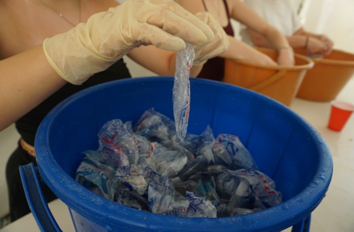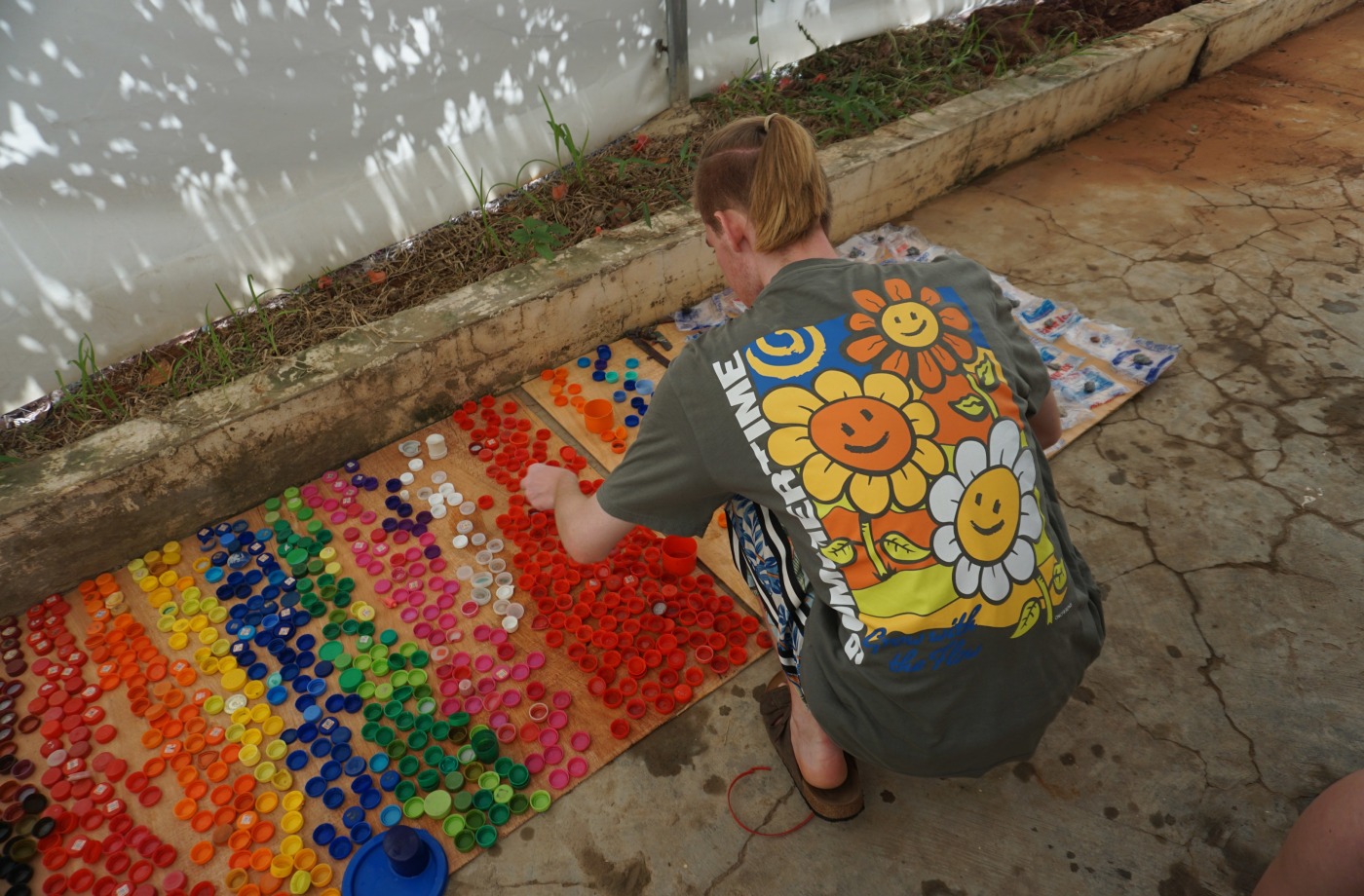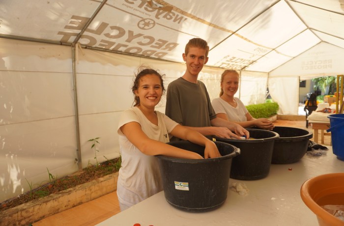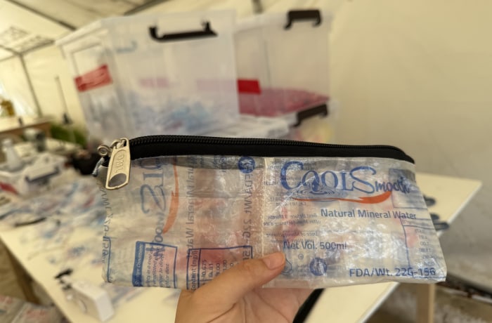 - Handwerkliche Tätigkeiten mit Schulkindern: Zweimal pro Woche werden Schulklassen ins Recyclingzentrum eingeladen, um den Prozess vor Ort zu erleben und aktiv teilzunehmen. Du kannst sie beim Waschen, Trocknen und Zuschneiden der Plastikbeutel unterstützen. Außerdem kannst du zusammen mit den Kindern mit Hand-Nähmaschinen Schultaschen und Federmäppchen aus recyceltem Plastik herstellen.