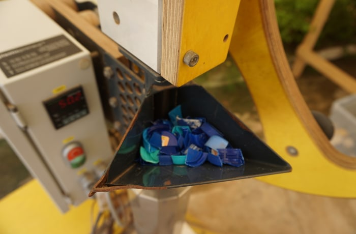 - Recycling-Maschine bedienen: Nutze die Maschine zur Herstellung von Perlen und Linealen für Schulkinder.
