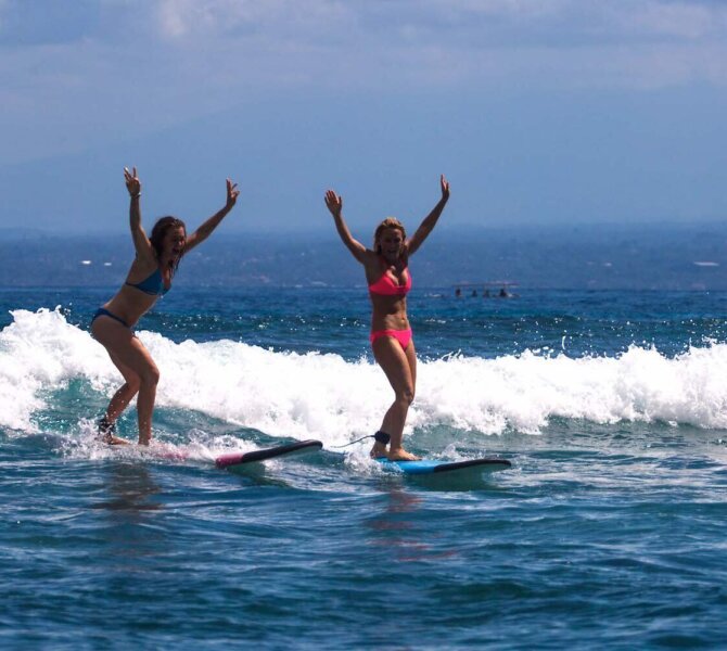 Nach deiner Projektzeit wartet das Surfcamp – dein Upgrade für Körper, Kopf und Seele. Stell dir vor: Du wachst in Canggu auf, greifst dir dein Board und lernst mit erfahrenen Surfcoaches, Wellen zu reiten, die du nie vergisst. Das Surfcamp ist für Anfänger*innen genauso geeignet wie für Fortgeschrittene. Neben den Surfkursen entspannst du am Pool, frühstückst gemeinsam mit anderen Weltenbummler*innen und erlebst das bunte Leben von Canggu mit seinen Cafés, Shops und Sonnenuntergängen.