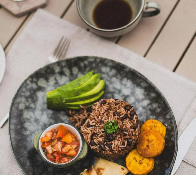 Ein typisches Mittagessen, bei dem Reis, Bohnen, frischer Salat und gebratene Kochbananen auf Fleisch, Fisch oder vegetarischen Varianten treffen – ein herzhaftes Wohlfühlgericht!