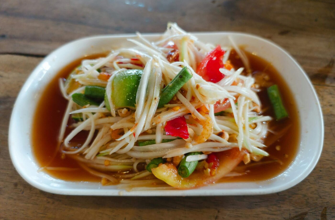 Knackig, würzig, erfrischend! Grüner Papayasalat mit Chili, Limette, Fischsauce und Erdnüssen. Schwer vorstellbar, aber das ist eine Geschmacksexplosion.