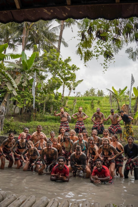 Am Nachmittag fahren wir ins Batubalan Village. Dort erwartet dich eine echte, balinesische Mutprobe – mit einer extra Portion Spaß: Wir weisen dich in das mystische Mepantigan ein, einer kraftvollen Mischung aus balinesischen Kampfkünsten im Schlamm, Feuertanz und traditionellem Drama. Der ideale Zeitpunkt deine Komfortzone zu verlassen, damit du ein paar Mindfucks und emotionale Altlasten loswirst.